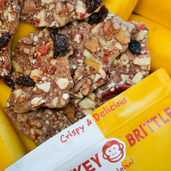 Monkey Brittle is a crispy, junk-free snack that tastes like banana nut bread in every crunchy bite. Made with just three organic ingredients—bananas, tree nuts, and raisins—it’s vegan, gluten-free, and perfect for healthy snacking on-the-go, from lunchboxes to road trips.