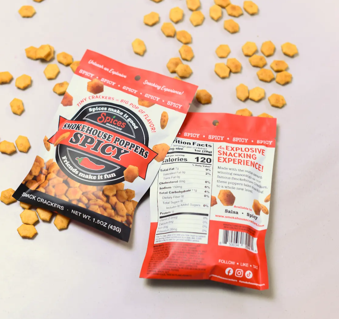 Smokehouse Crackers, handcrafted by Alabama duo Robert and Lynn Entrekin, bring bold flavor in every bite with their signature Spicy, Garlic Parmesan, BBQ, and Salsa blends. What began in their catering business in 2017 has grown into a Southeast favorite — even earning the title Best Snack in Alabama 2021.