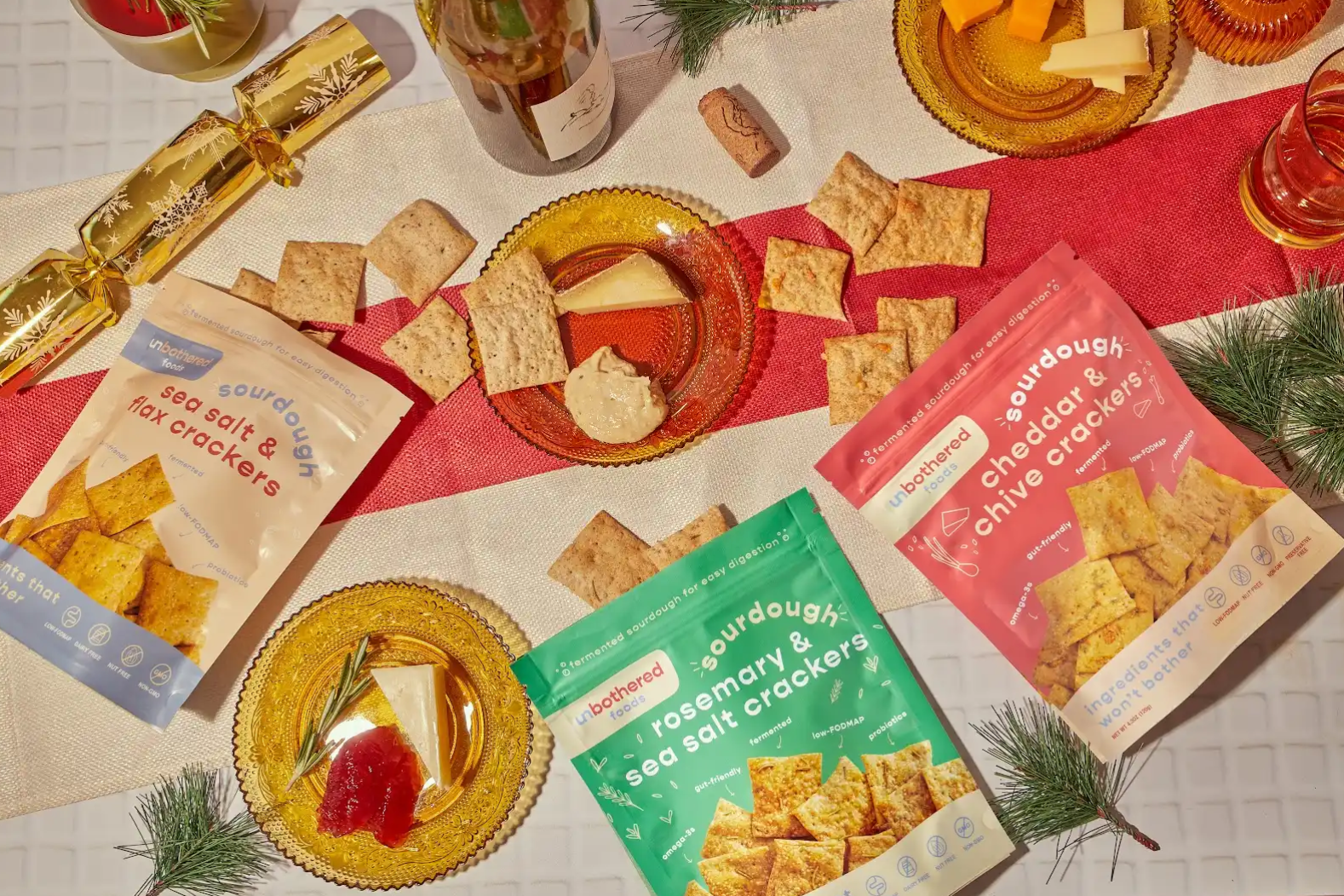 Unbothered Foods is a deliciously-fermented sourdough cracker brand. We harness the magic of fermentation to create a tangy, crunch snack - perfect for any charcuterie board. Crafted by a gut-health dietitian, our sourdough crackers are easy to digest and made with simple ingredients like sourdough starter, olive oil and sea salt. Add to your holiday spread, pair with your favorite cozy dip, or snack on them right out of the bag!
